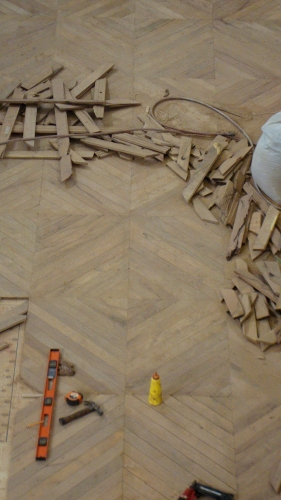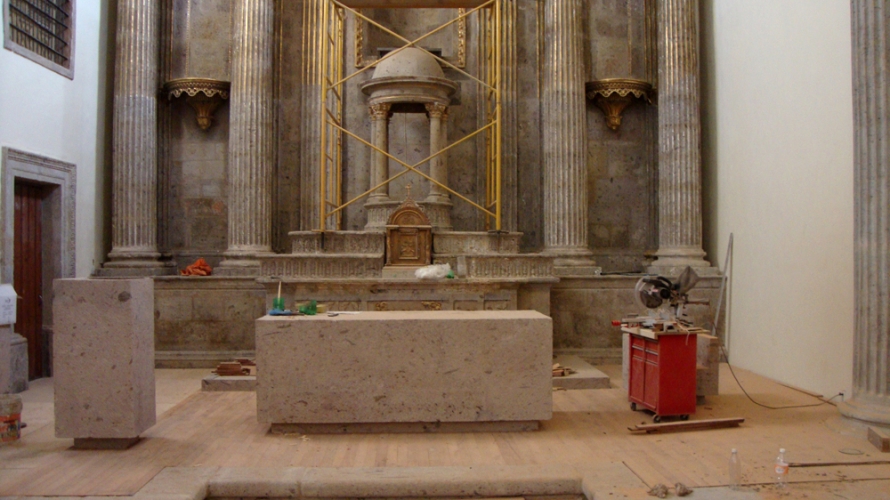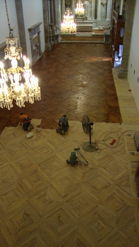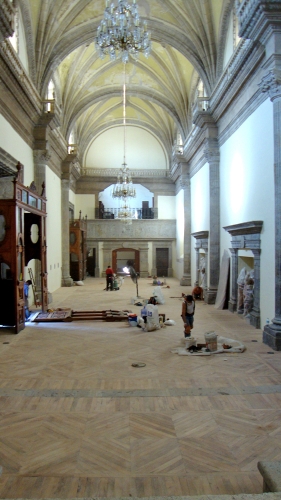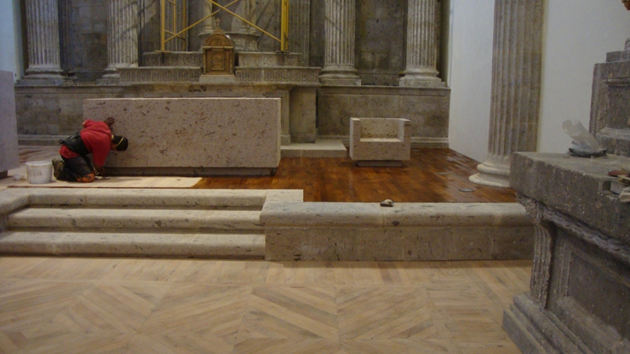 Colocación de duela de Mezquite en Templo de Santa Mónica que data del Siglo XVIII de acuerdo al diseño original, Guadalajara, Jalisco.