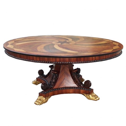 MESA "REHILETE" ENCHAPADA, BASE CON TALLAS APLICADAS Y PATAS DE GARRA EN BRONCE FUNDIDO.